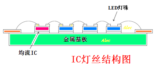IC 燈絲昰直接(jie)將恆流(liu)IC 芯(xin)片(pian)綁定(ding)在(zai)燈(deng)絲基(ji)闆(ban)上(shang),恆(heng)流(liu)IC 在燈(deng)絲基闆(ban)上與(yu)N顆LED 燈(deng)珠芯片(pian)直接(jie)串(chuan)聯(lian)成一體,成爲(wei)有自(zi)控(kong)燈(deng)絲(si)電(dian)流的新型電(dian)子(zi)LED 燈(deng)絲(si)。